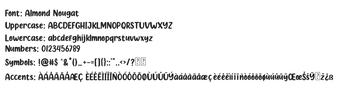 อัลมอนด์นูกัตเป็นครอบครัวตัวอักษรที่หลากหลายซึ่งออกแบบมาสำหรับ Windows ที่รวมความอบอุ่นและความสนุกสนานไว้ด้วยกัน ขอบที่โค้งมนและเส้นโค้งที่เป็นมิตรสร้างรูปลักษณ์ที่แปลกประหลาด ทำให้เหมาะสำหรับโครงการที่ต้องการโทนที่ไม่เป็นทางการแต่เชิญชวน ตัวอักษรนี้ถูกสร้างขึ้นเพื่อรักษาความชัดเจนและความอ่านง่าย ทำให้สามารถใช้งานได้อย่างมีประสิทธิภาพในแอปพลิเคชันการออกแบบต่างๆ